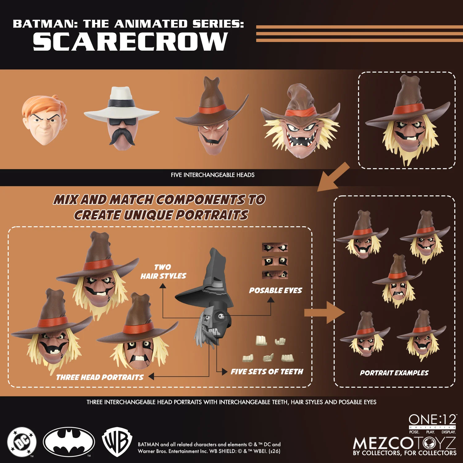 El Espantapájaros Colectivo One:12 captura fielmente el aspecto animado del villano con un detalle fiel a la pantalla y una presencia inquietante. Con una amplia gama de retratos, placas faciales, peinados y dientes intercambiables, junto con ojos articulados en cabezas seleccionadas, Scarecrow puede personalizarse para crear un amplio espectro de expresiones que inducen miedo—desde amenazas sutiles hasta pesadillas totales.