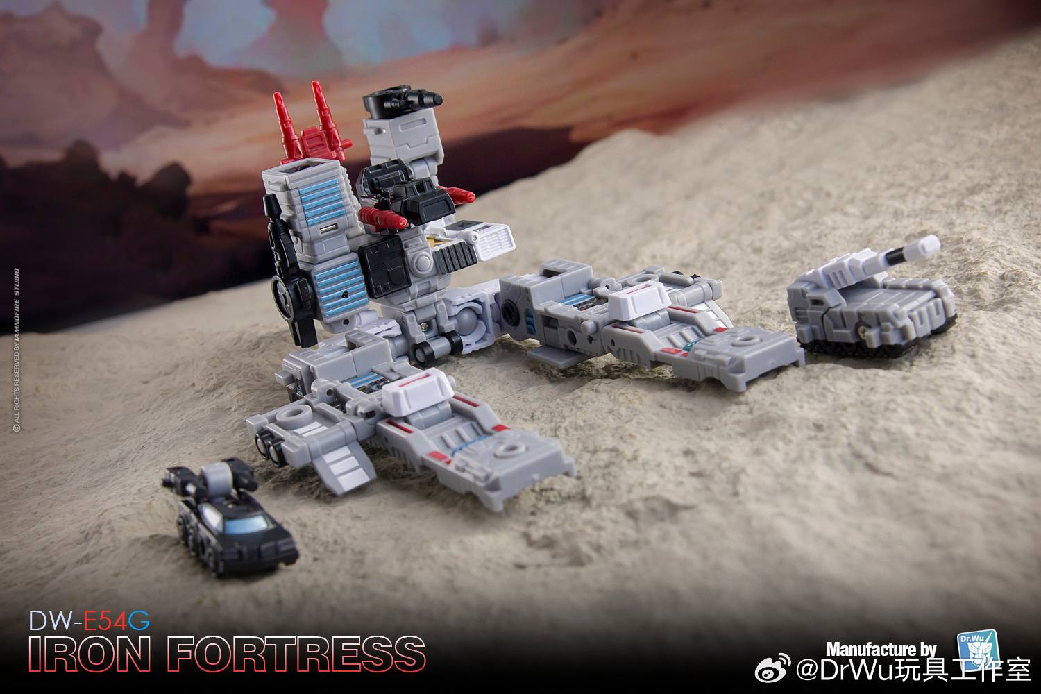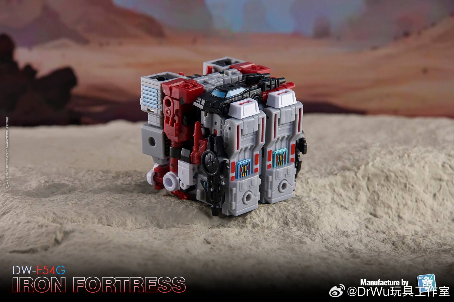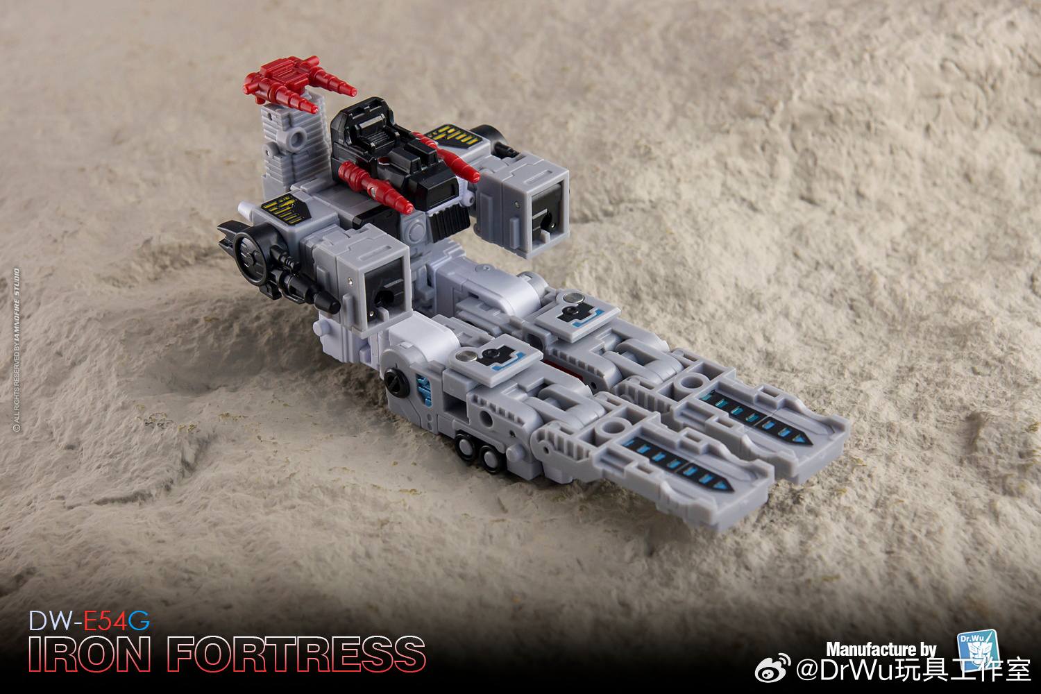 El Iron Fortress DW-E54G se transforma de estación de batalla móvil a base de robots, luego figura de acción y de nuevo en figuras de acción. Iron Fortress viene con robots esbirros que pueden poblar el modo base.