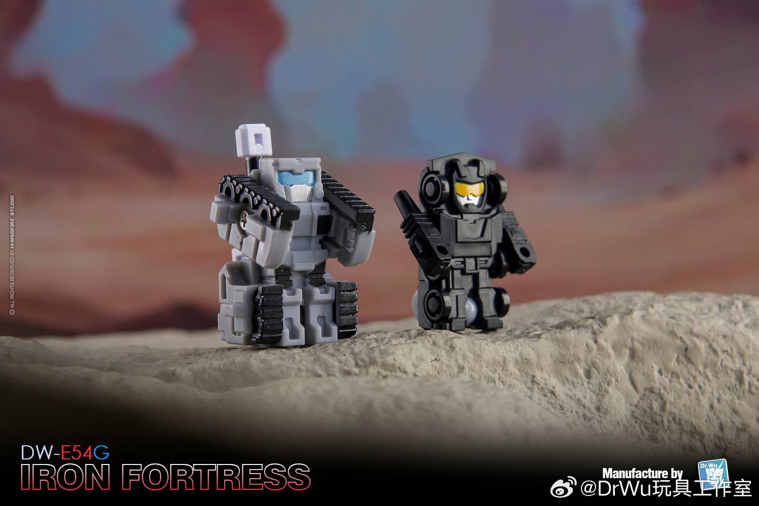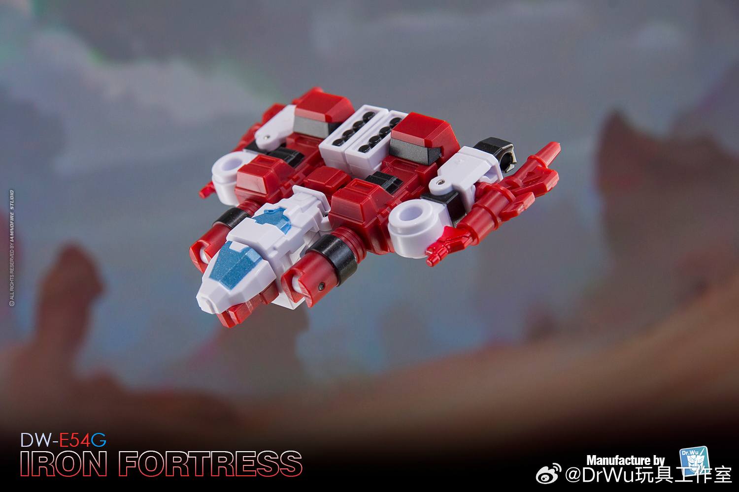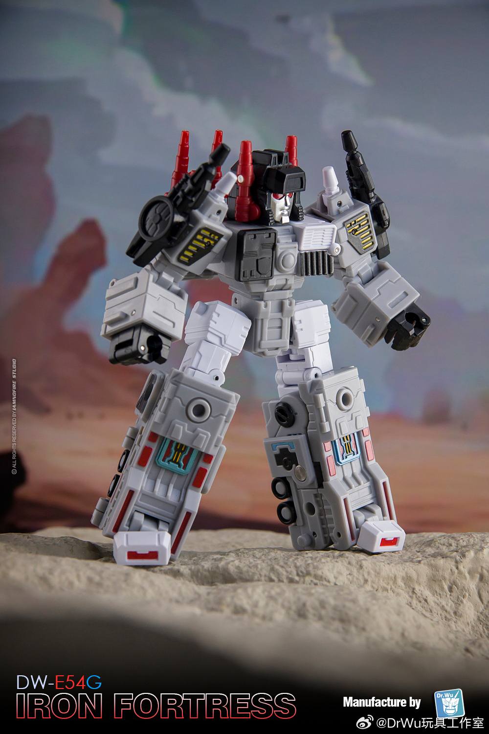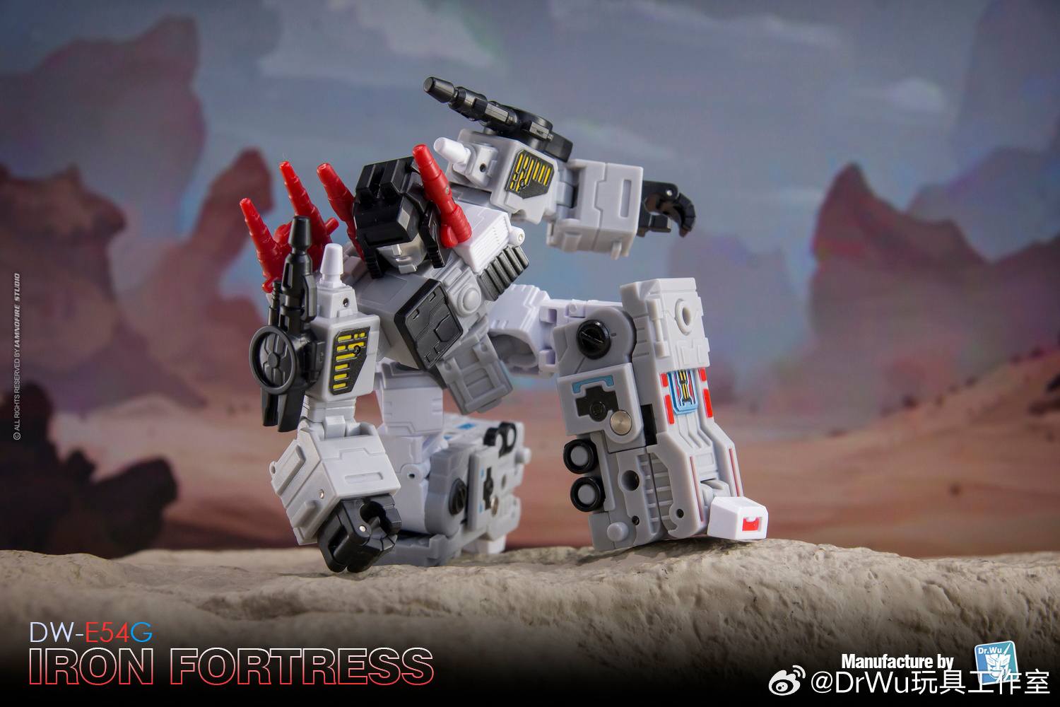 El Iron Fortress DW-E54G se transforma de estación de batalla móvil a base de robots, luego figura de acción y de nuevo en figuras de acción. Iron Fortress viene con robots esbirros que pueden poblar el modo base.