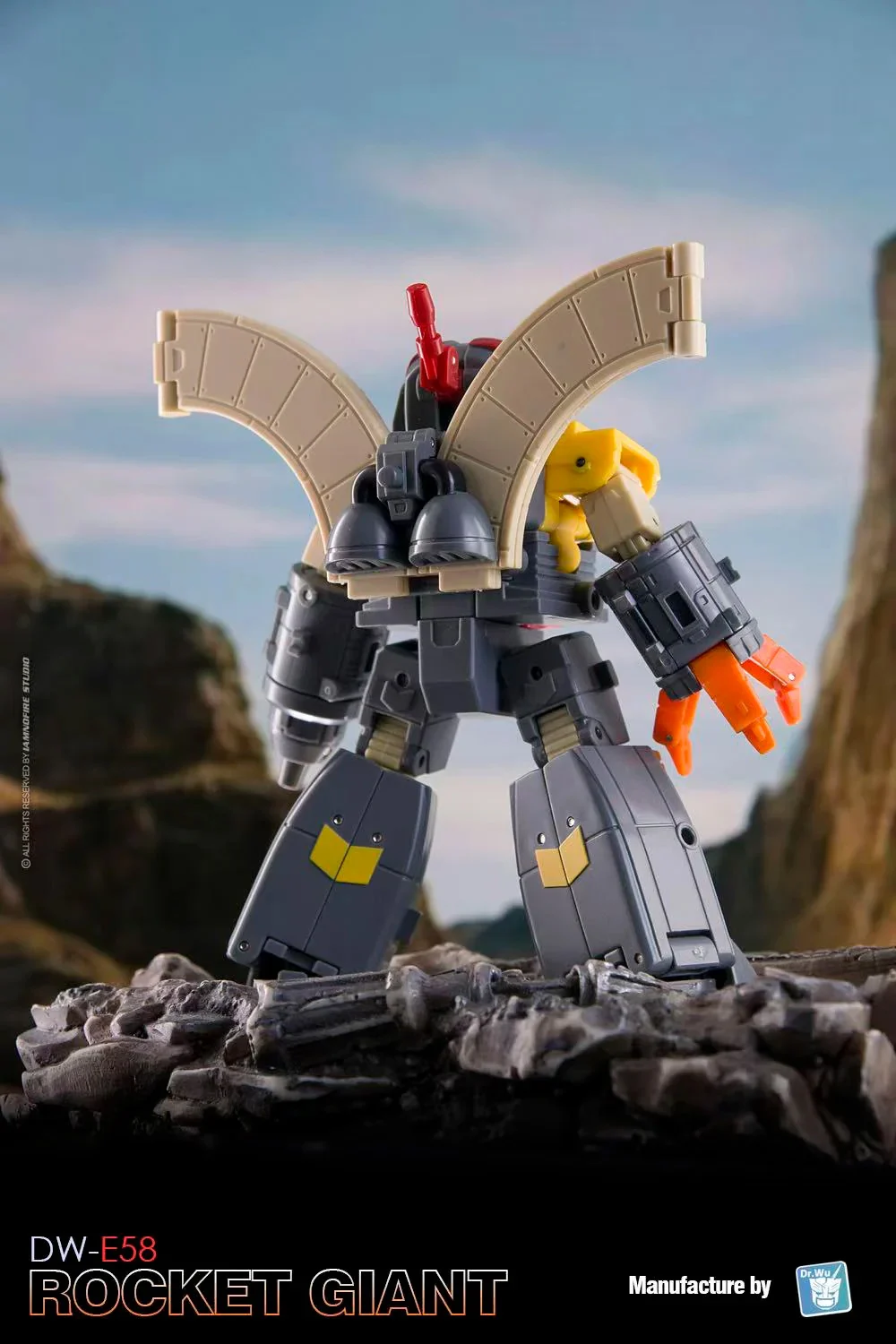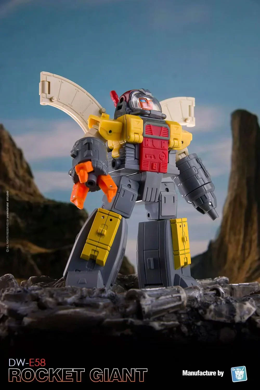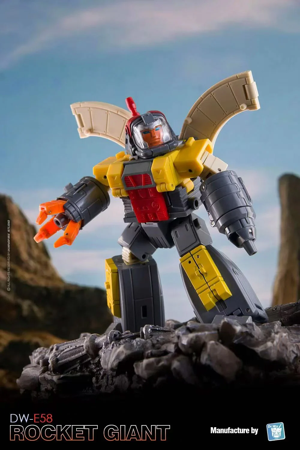 El Dr. Wu DW-E58 Rocket Giant se transforma de una figura de acción robótica completamente articulada al modo base y viceversa. ¡También puede formar un cubo para apilar y almacenar! Rocket Giant viene con dos mini robots para ayudarle en sus tareas de defensa. Rocket Giant mide aproximadamente 3,2 pulgadas de alto en modo robot.