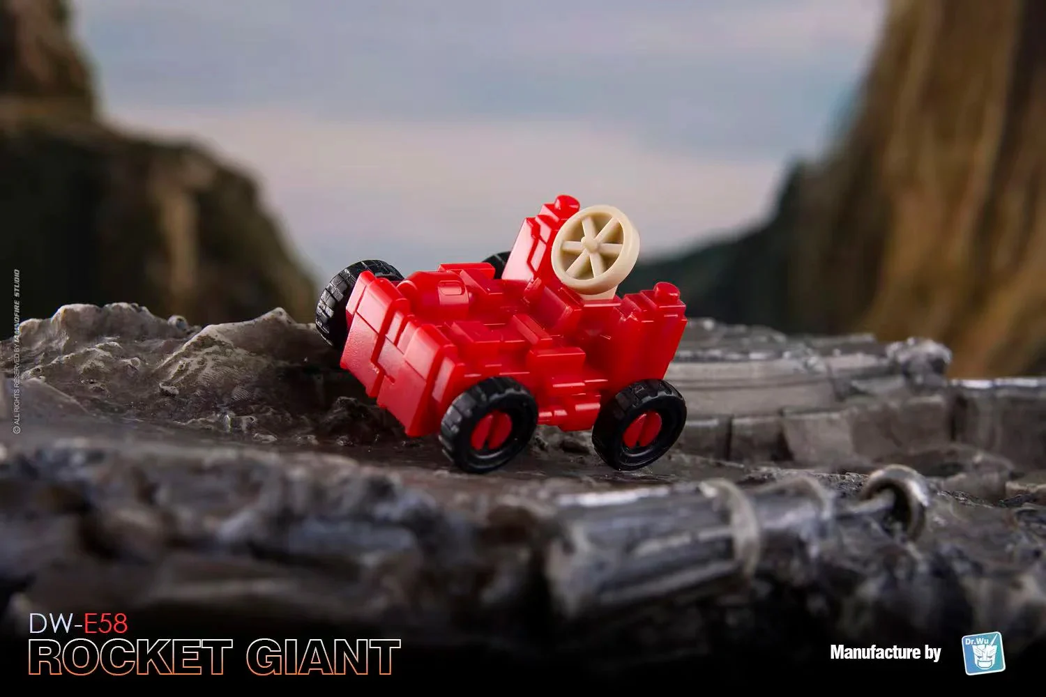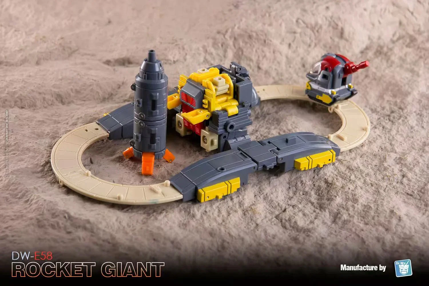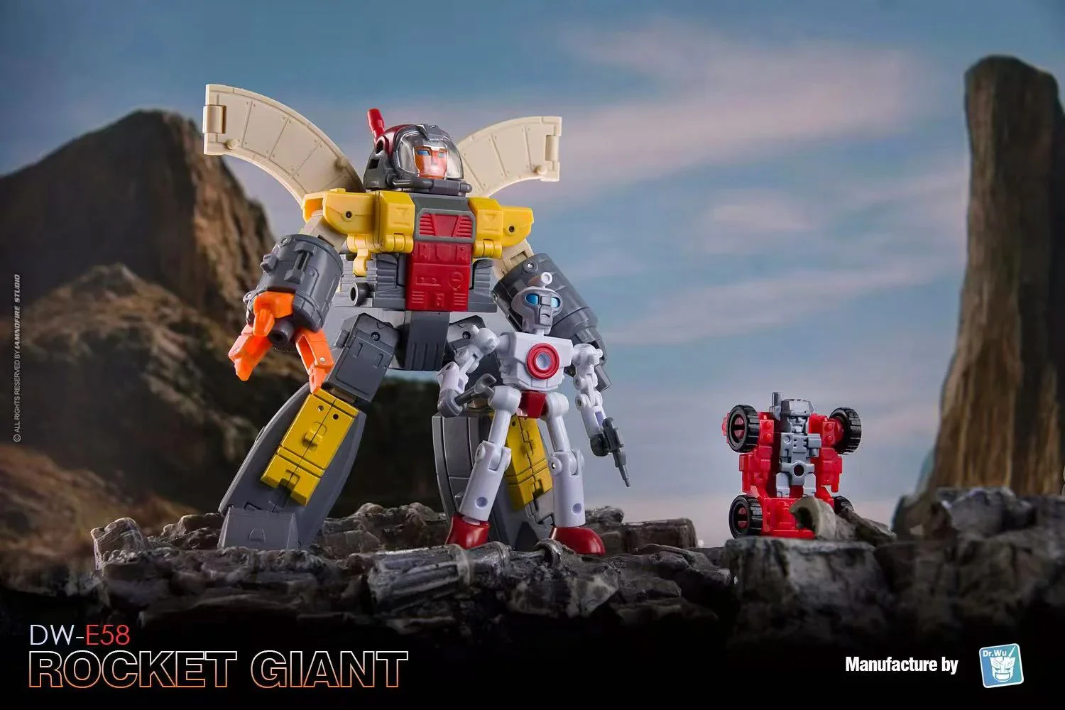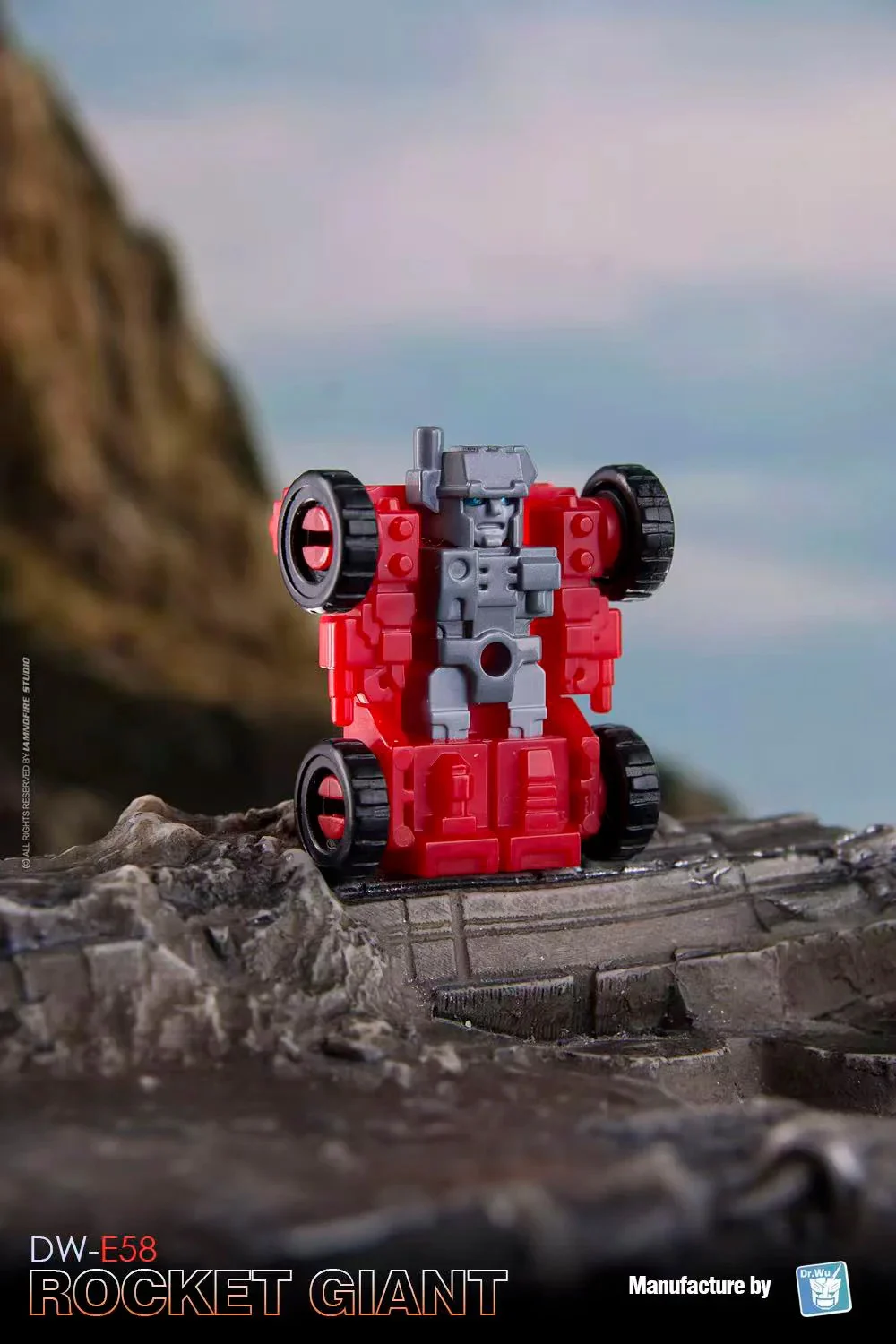 El Dr. Wu DW-E58 Rocket Giant se transforma de una figura de acción robótica completamente articulada al modo base y viceversa. ¡También puede formar un cubo para apilar y almacenar! Rocket Giant viene con dos mini robots para ayudarle en sus tareas de defensa. Rocket Giant mide aproximadamente 3,2 pulgadas de alto en modo robot.