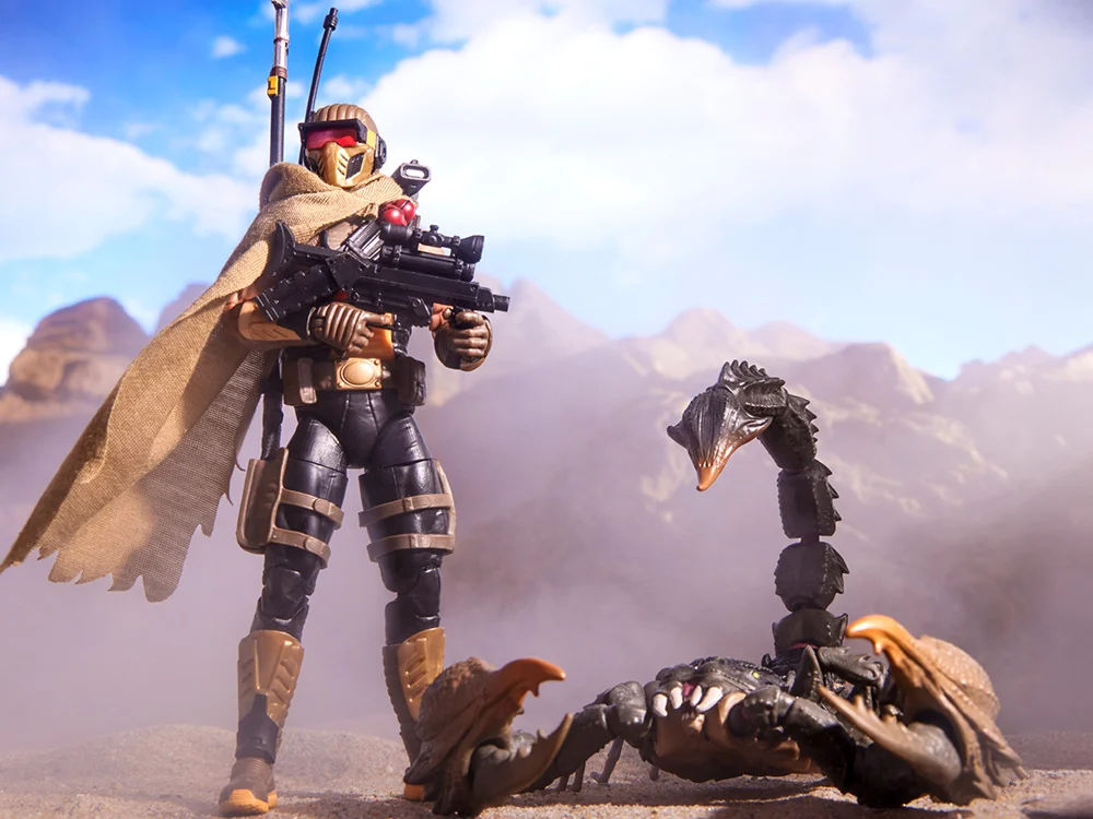 Nuevo en la línea G.I. Joe Classified Series, Cobra Desert Scorpion & SKRP10N-25 pet vienen listos para la aventura, con múltiples puntos de articulación para una alta posabilidad. Esta figura de Cobra Desert Scorpion contiene 12 piezas accesorias inspiradas en el personaje, incluyendo una placa frontal intercambiable para múltiples looks, mochila con cable de conexión, 2 cuchillos, lanzador de garfio con gancho extraíble y línea adjunta, picana de escorpión, 2 garras y accesorios para armas; además de capa de softgoods y falda de casco. SKRP10N-25 es una mascota colosal completamente articulada con pinzas de garra masivas y una pieza de cola suelta.