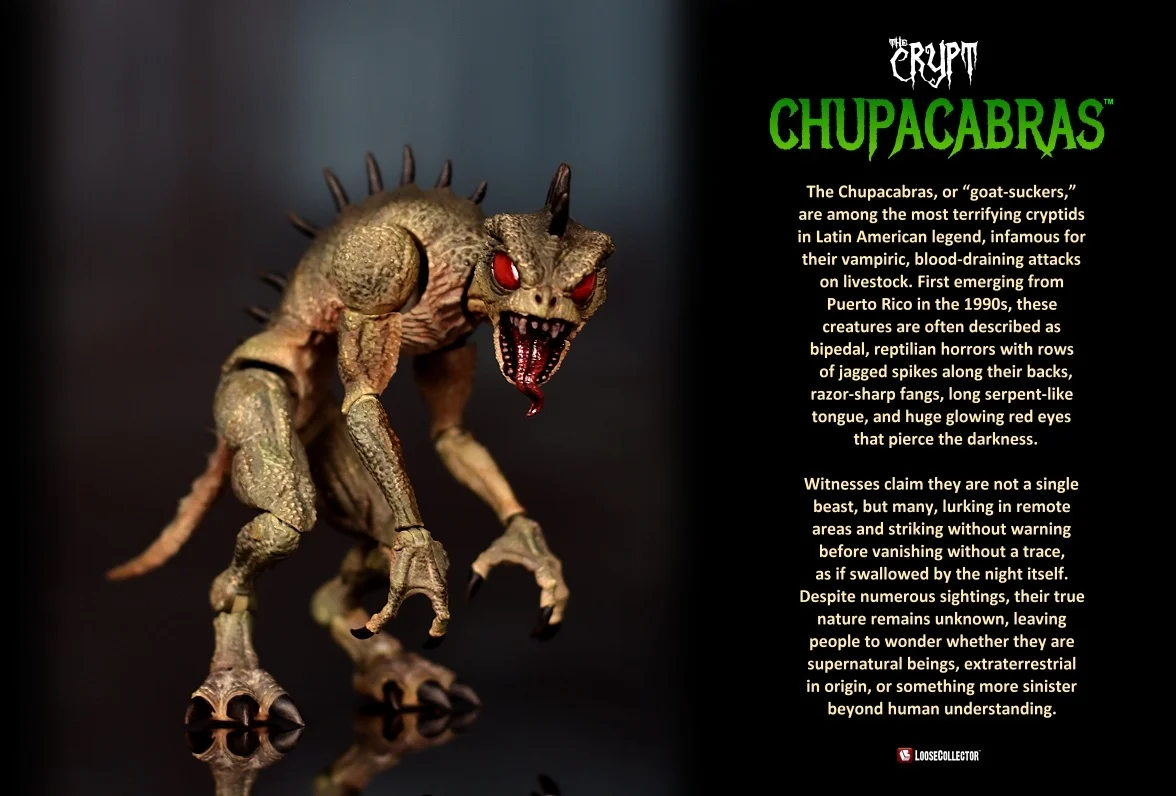 Los Chupacabras, o «chupacachas», son de los críptidos más aterradores de la leyenda latinoamericana, infames por sus ataques vampíricos y sangrientos al ganado. Surgiendo por primera vez de Puerto Rico en los años 90, estas criaturas suelen describirse como horrores bípedos y reptilianos, con filas de pinchos dentados a lo largo de la espalda, colmillos afilados como navajas, larga lengua serpentina y enormes ojos rojos brillantes que atraviesan la oscuridad.