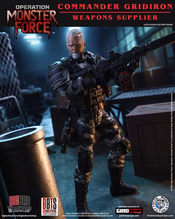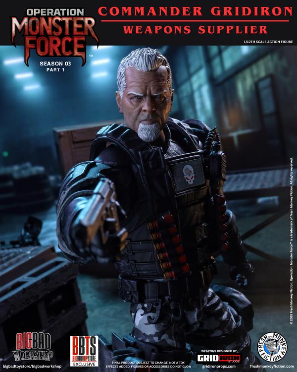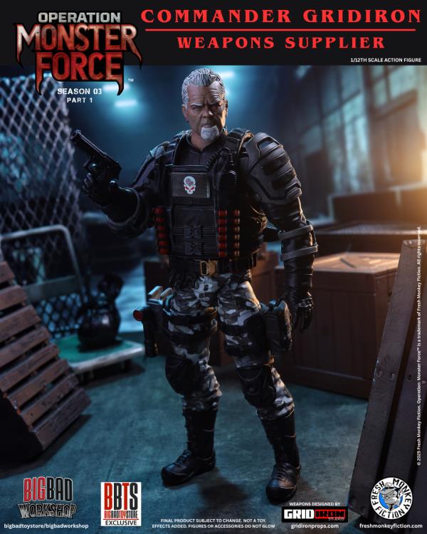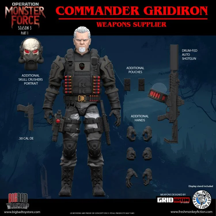 Cuando el General Brown necesita poner en marcha un equipo de respuesta a amenazas únicas como un antiguo faraón hechicero, un ejército ninja o el regreso de R.I.O.T., el Comandante Gridiron puede armar a esos equipos en cualquier momento. Ya sea munición plateada para una ametralladora anti-hombre lobo calibre 50, o una ametralladora montada en helicóptero que puede ser transportada por un sasquatch, el Comandante Gridiron puede hacer que eso suceda.